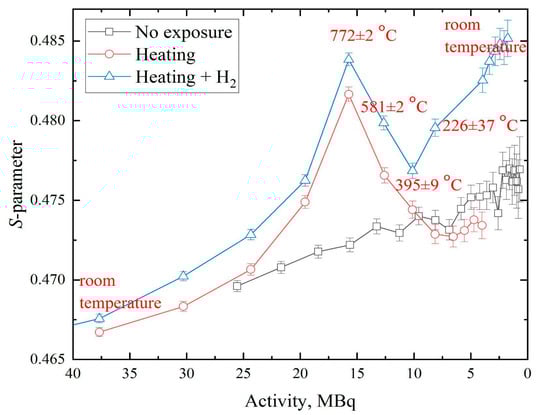 The dependences of the S-parameter on 64Cu activity during the heating of samples with source in the vacuum and hydrogen atmosphere are shown in Figure 11. The presented data show that the heating led to a faster increase of S-parameter than without heating. This effect was due to the increase of equilibrium vacancies concentration with temperature. At the beginning of the experiment with heating, the curve of the S-parameter aligned closely with the experiment without heating, confirming that the data from different (varying only in area) 64Cu-based positron sources agreed well.