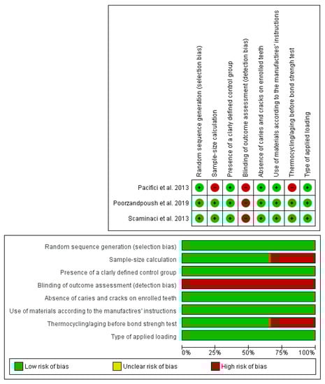 | Evaluated outcomes | SBS (Mpa) + mode of failure (adhesive; cohesive or mixed). | µSBS (Mpa) + mode of failure (adhesive; cohesive dentin failure; cohesive build-up failure; mixed with 1 and 2 and mixed failure with 1 and 3. | SBS (Mpa) + mode of failure (adhesive; cohesive or mixed). |