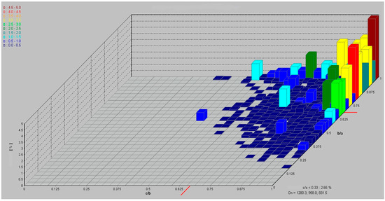 The executed processes of tanning shavings screening showed that over 80% of their composition constituted grains of less than 8 mm, with approximately 35% of those being below 1 mm. Dry tanning shavings were characterized by very low bulk density that did not exceed 0.1 g/cm3. The pore structure of the tested tanning shaving samples consisted mainly of mesopores and macropores (a relatively low BET (Brunauer–Emmett–Teller) specific surface area (SSA) in the range of 2.55–3.51 m2/g) [60]. The results of the shavings shape analysis are given in Table 1. The dominant shapes of shavings were spherical (70.14%) and rod-like (23.77%) (in accordance with Zingg’s classification, Figure 1).