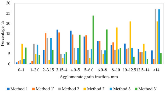 Figure 2 shows a comparison of optimum grain-size compositions of agglomerates produced in line with the methods described above (Methods 1–3; two examples per each method). The developed methods show it is possible to produce agglomerates on the basis of waste shavings with varying grain-size composition (with varying granules diameter in relation to the given intended purpose). The best quality granules were obtained from shavings previously mixed with a water glass solution (Methods 2 and 3).