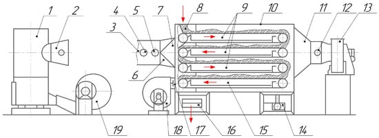 Functional diagram of a horizontal dryer: 1—fire-chamber; 2, 5—thermometers; 3, 11—pipelines; 4, 7, 12, 17—butterfly valves; 6—diffuser; 8—feed hopper; 9, 15—conveyor belts; 10—drying chamber; 13, 18, 19—radial centrifugal fans; 14—reducer; 16—discharge conveyor.
