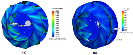Von Mises stress distribution in the impeller: (a) impeller of the basic design, and (b) impeller with central disk; impeller material—Hardox 450 steel; rotation frequency—1000 min.