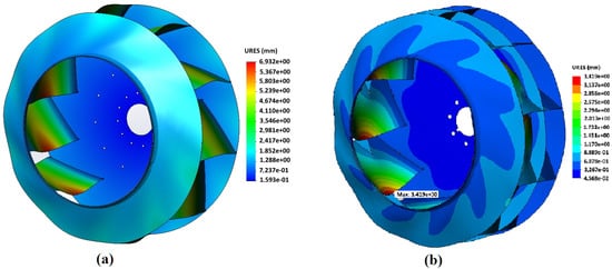 Distribution of deformations in the impeller: (a) impeller of the basic design, and (b) impeller with central disk; impeller material—Hardox 450 steel; rotation frequency—1000 min.