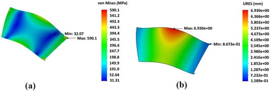 Stress–strain state of an impeller blade of a basic design: (a) stresses; (b) deformations.