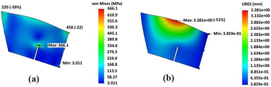 Stress–strain state of an impeller blade with an additional central disk: (a) stresses; (b) deformations.
