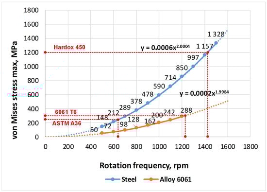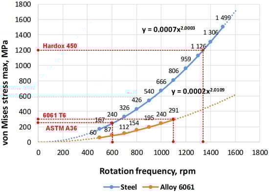 The graphs of stresses in the impeller on the rotational speed for ASTM A36 and Hardox 450 steel coincide because their values of density, elastic modulus and Poisson’s ratio are the same. The difference between these materials lies in the magnitude of the yield strength and strength itself. Logically, the graphs for the aluminium alloy differ significantly from the graphs for steel. This is because of the essential difference in the physical and mechanical characteristics of these materials.