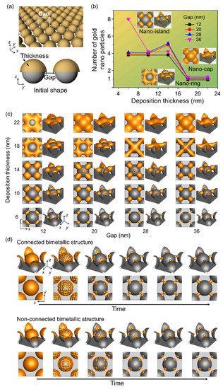 We investigated the effects of deposition thickness and gap between the spherical patterns over the substrate on the shape of the bimetallic nanostructures formed during thermal dewetting (Figure 3). Facile fabrication of spherical patterns on the substrate has been reported using nanoparticles and general substrates [31]. Figure 3a shows a schematic diagram of the simulation used to analyze the number of nanoparticles formed during thermal dewetting as a function of the gap between the patterns and the thickness of the deposited materials. When the ratio of the gap to thickness is less than 1 and the thickness is greater than 15 nm, a nano-ring is formed with the deposited material covering the spherical patterns (Figure 3b,c), whereas a nano-cap is obtained when the gap to thickness ratio is between 1 and 2 and the thickness is greater than 15 nm. When the gap to thickness ratio increases beyond 3, a nano-island structure is formed, and an increase in the ratio beyond 6 yields separated structures on the substrate. Particles formed by thermal dewetting are connected if the gap is small, but they are not connected if the gap is sufficiently large (Figure 3d).