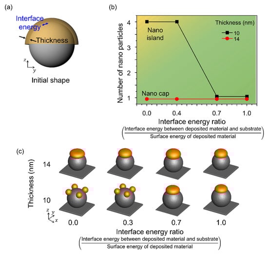 Figure 5 illustrates the change in shape with respect to the surface energy of the deposited material. Figure 5a shows a schematic illustration for the simulation performed considering the surface energy of the deposited material and the deposition thickness, and the radius of the spherical pattern on the substrate was 80 nm. The range of surface energy considered was 0.3–1.6, and it was normalized using the surface energy of Au. When the radius to thickness ratio was less than 4, a single nanoparticle was observed irrespective of the surface energy, which indicated a nano-cap structure. The number of nanoparticles formed by thermal dewetting increased with an increase in the surface energy of the deposited material. When the radius to thickness ratio was more than 7, nano-island structures were obtained. With an increase in surface energy to 1.6, a nano-ring was formed at the deposition thickness of 20 nm due to the increase in the material deposited at the edge resulting in accelerated retraction with an increase in the surface energy. With an increase in the surface energy, the deposited material combined locally, and the number of nanoparticles increased, especially at low deposition thicknesses.