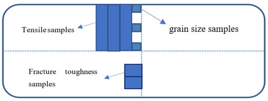 After casting was completed, slices of the two different grain refined ingots were taken to evaluate the microstructure, grain size, and mechanical properties of the as-cast material according to the sampling diagram in Figure 1. The ingot samples were solution heat treated and artificially aged (heat solution treatment and age process were 479 °C × 50 min and 121 °C × 4 h + 163 °C × 20 h, respectively) prior to mechanical testing to eliminate the effects of the hot rolling process. The tensile properties and fracture toughness of ingot after heat treatment were then measured by an Instron 5985 tensile machine (INSTRON, Boston, MA, USA) and Instron 8802fatigue test machine (INSTRON, Boston, MA, USA), respectively. The fracture surface for ingots with different grain refiners were analyzed by scanning electron microscopy (SEM, FEI, Hillsboro, OR, USA).