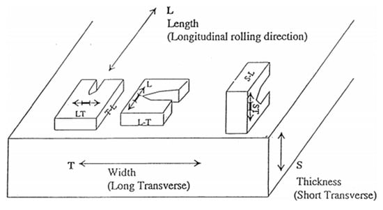 Samples for the 100 mm 7050-T7651 plate were taken according to the requirement of the AMS2355 standard for tensile property and fracture toughness test, and the tensile properties and fracture toughness were tested on T/4 of plate by an Instron 5985 tensile machine and Instron 8802 fatigue test machine, respectively. Specimen orientations for fracture toughness are shown in Figure 3.