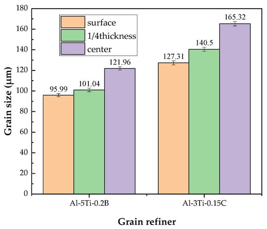 The grain size from the edge to the center of the 7050 ingot along with the casting direction was observed, five pictures were selected for each position, and the average grain size was analyzed by the intersection method according to ASTM E112 standard [23]. The microstructure and calculated grain size of the ingot with Al-5Ti-0.2B and Al-3Ti-0.15C grain refiner are shown in Figure 4 and Figure 5, respectively. From Figure 4, the grain size from edge to center is increased, with a grain size of 95.99 μm, 101.04 μm, and 121.96 μm from edge to center for the ingot with Al-5Ti-0.2B grain refiner and 127.31 μm, 140.50 μm, and 165.32 μm with Al-3Ti-0.15C grain refiner, respectively. According to the study [17] by Hiromi, the average grain size of the 7050 ingot without grain refiner was 210 μm, and both the Al-5Ti-0.2B and Al-3Ti-0.15C grain refiner have refined the grain size.