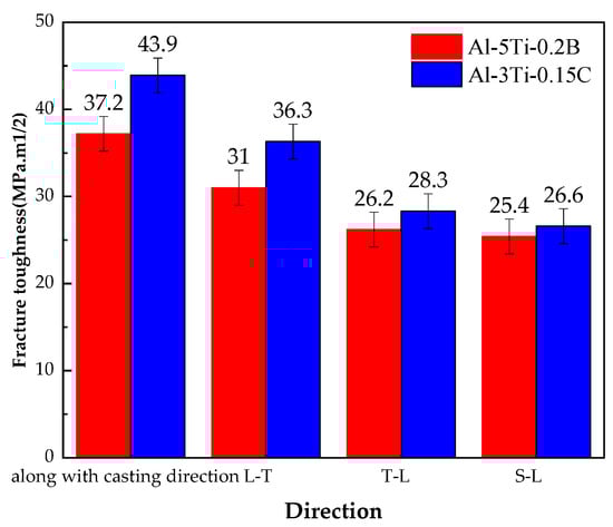 Fracture toughness of 7050 ingot after heat treatment and 7050-T7651 100 mm plate for different grain refiners in different directions.