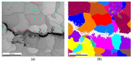 The EBSD analysis results of different refiners for ingots after heat treatment at the crack tip are shown in Figure 8. As can be seen from Figure 8, the ingot containing Al-3Ti-0.15C refiner has intergranular and transgranular fracture, and the ingot produced by Al-5Ti-0.2B refiner presents intergranular fracture. Moreover, the ingot microstructure has a genetic effect: the grain size of the ingot with Al-3Ti-0.15C grain refiner is larger under the same refiner adding amount and casting process compared with Al-5Ti-0.2B grain refiner, which leads to increase in fracture toughness of the final product.