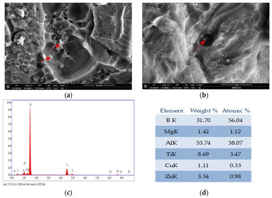SEM analysis of the fracture surface for 7050-T7651 100 mm thick plate with different refiners were carried out. The samples in the T-L direction have both intergranular and transgranular fractures, and a large amount of second phases are distributed at the same time. The enlarged SEM photos of the fracture surfaces with different grain refiners are shown in Figure 9. The energy dispersive spectrometer (EDS) analysis shows both TiB2 and TiC particles have a granular shape, and the size of TiB2 particles is larger than that of TiC particles; the TiC particles were difficult to find under the scope of SEM. In addition, TiB2 particles are more aggregated than TiC particles, whereas TiC particles are more dispersed and have stronger resistance to crack propagation. The basic characteristics of fracture are basically consistent with the paper [25] researched by Zhang Xinming from Central South University.