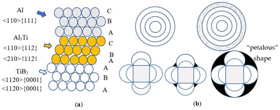Grain refiner nucleation schematic diagram: (a) Orientation relationship between Al, Al3Ti, and TiB2; (b) Nucleation diagram of Al-5Ti-0.2B and Al-3Ti-0.15C refiner during solidification.