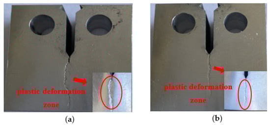 If the grain size is small enough, plasticity will be enhanced without detrimental, low energy, intergranular fracture for thin products under plane stress. However, for thick products under plane strain, fracture is usually controlled by coarse particles, and a recrystallized grain structure is preferable. Teleshov [26] studied the effect of grain size on fracture toughness and strength of AK4-1CH extrusion products. It was shown that the larger grain size products have higher fracture toughness than the smaller grain size products in L-T, T-L, and S-L directions, especially in the T-L direction. By comparing the microstructure, properties, and the distance between the vertical crack plane and the second phase in the propagation direction, it was found that the main reason for the different fracture toughness of AK4-1CH products may be the smaller extent of grain boundary in the path of plastic deformation. To overcome this deformation, the deformation in neighboring grains is needed. However, the stress generated far from the crack tip is not enough, which leads to the increase in the size of the plastic deformation zone, resulting in the increase in KIC. According to the study [27] of Krasovskii, the depth of the plastic deformation zone is related to the fracture toughness and yield strength of the product. According to the equation λ = 0.128 ∗ (KIC/δ0.2)2, the value for the ingot with different grain refiners is 1.080 mm and 0.787 mm, respectively, which are larger than the average grain size. Fracture path for the 7050 ingot with different grain refiners is shown in Figure 11. T range of the plastic deformation zone with large grain size was large, which affected the fracture mode at the crack tip.