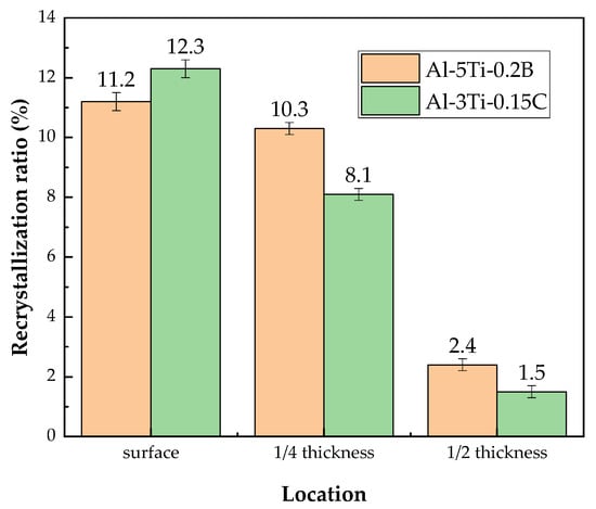 As discussed in Section 2, the recrystallization ratio is one of the factors affecting fracture toughness: the higher the recrystallization fraction, the lower the fracture toughness. The recrystallization ratio of the 7050-T7651 plate in different thickness positions with Al-5Ti-0.2B and Al-3Ti-0.15C grain refiners are shown in Figure 12. From surface to 1/2 thickness, the recrystallization ratio for the 7050 plate with Al-5Ti-0.2B grain refiner is 11.2%, 10.3%, and 2.4%, respectively, and 12.3%, 8.1%, and 1.5% with Al-5Ti-0.2B grain refiner. There are no obvious differences in the recrystallization ratio for the 7050-T7651 plate with different grain refiners.