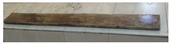 The fabricated bamboo fiber laminate is shown in Figure 2. The contact surfaces of both the RC beam and the bamboo laminate were roughened mechanically with a hand grinder to ensure proper adhesion and prevent premature debonding. A coat of adhesive was applied on the surface of the beam, after which the laminate was placed on the adhesive, and pressure was applied to it for about 24 h.