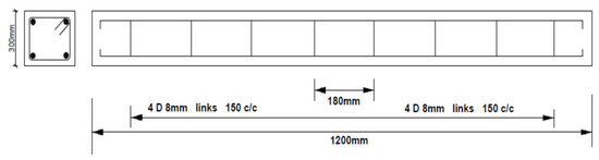 Each rectangular beam was 300 mm × 200 mm in cross-section and 1200 mm long. The steel reinforcement consisted of two high yield 16 mm diameter steel bars at the bottom and two 12 mm diameter bars at the top. The shear reinforcements consisted of 10 mm diameter bars 150 mm center to center. The clear concrete cover was 25 mm on all sides of the beam specimens. The second and third beams had their reinforcements protruded out of the concrete to establish electrical connections to induce accelerated corrosion. A section of the beam showing reinforcement details is presented in Figure 3.