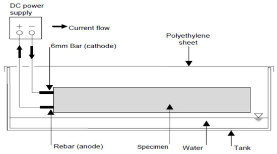 where m = mass loss, a = atomic mass of iron (55.85 gr), t = corrosion process time, I = corrosion current, n = reacting electrode valence for the material (which for steel is 2), and F = faraday’s constant (96,500 C/mol). Figure 4 and Figure 5 show the schematic of accelerated corrosion set-up and simulated corrosion set-up in the laboratory, respectively.