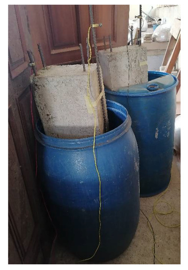 All the specimens were tested in a 50 tons universal testing machine (UTM), manufactured by Dongguan HongTuo Instrument Co.,Ltd., GuangDong, China. After the 28-day curing at 20 °C was done, the beams were washed, and their surface was cleaned and checked for cracks. The second and third beams were then immersed about 2/3 of a 200 L drum containing 0.6 mol NaCl solution, which was then left for a week. The tensile reinforcements served as the connecting point for the anode, while an external reinforcement served as the cathode. Alternate wetting and drying were also used in inducing accelerated corrosion to save energy costs for three weeks with two weeks of wetting and a week of drying. Figure 6 presents a corroded beam and the process of gluing the laminate to its surface.