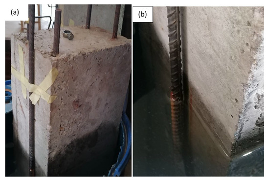 The corrosion phenomenon causes a greater volume of the rust in concrete composite; thus, it results in a most detrimental effect of cracking and spalling of the concrete cover due to tensile stresses developing [28,29]. Along with the aesthetics being affected, the mechanical performance and load capacity are also adversely affected by cracking. Literature reports show that, as the cracks become bigger, water permeation increases, allowing aggressive agents access to the reinforcements. The aggressive agents initiate the corrosion process with water and oxygen [30]. For steel corrosion to occur, certain conditions must be met: An electrolyte, a metallic connection, and a minimum of two steel locations of the steel rebar at different energy levels.
