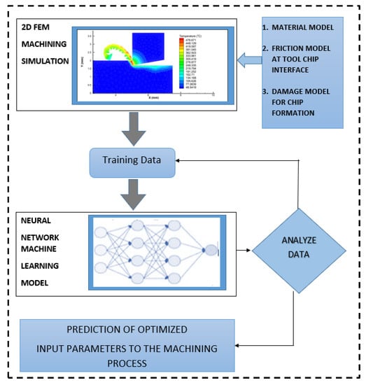 Peng et al. (2019) [9] conducted a combined study using 2-dimensional finite element analysis and comparing the obtained values to those obtained experimentally. The dataset was then used to train a neural network to obtain values for the specific cutting forces involved in the machining process. The authors convey that the developed network may not be able to be generalized as it is very sensitive to the hyperparameters involved; this led them to vary the depth and complexity of the neural network to increase the accuracy of the network as they continue to train the network on FEM data. This provides a comparable baseline for the methodology of this current research, as it is conducted in a very similar manner to the network proposed in this paper. Serin et al. (2017) [10] discussed the future of predictive analytics through the application of deep learning, and the shift towards Industry 4.0 by establishing metrics based on quality, performance, and energy consumption. They used variance analysis to determine the effect of input parameters on the desired output parameters, which are based on machining quality, performance, and energy consumption. They suggested that using training data from specific machining processes allows for the creation of highly accurate models. The use of this variance analysis enables us to determine which input parameters can be pruned for specific output variables when developing the general neural network for the machining of AISI 630 steel.