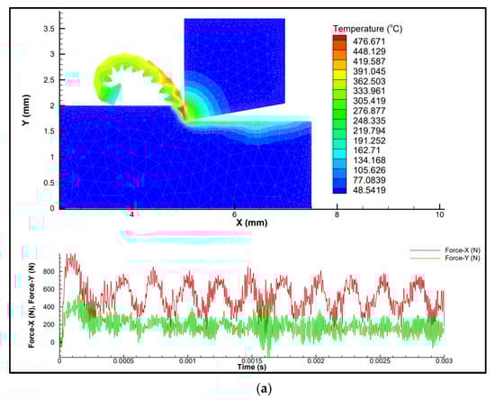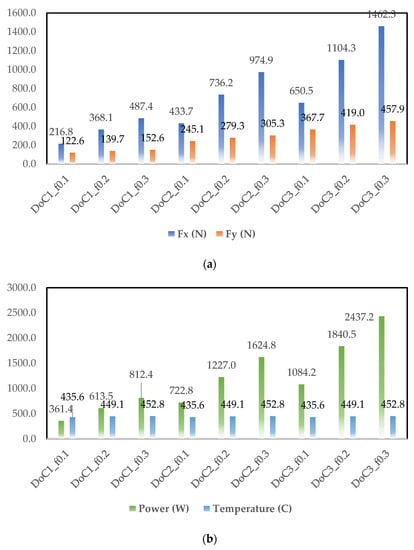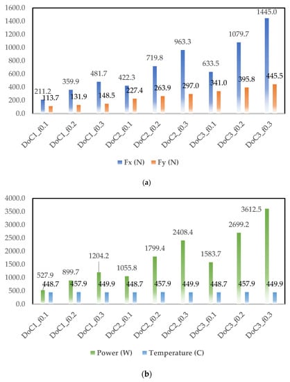 Based on the simulation results, cutting force components (Fx and Fy), power, and cutting temperature are plotted in Figure 5, Figure 6 and Figure 7. As observed in Figure 3, Figure 4, Figure 5 and Figure 6, at different cutting speeds ranging from 50–150 m/min it can be seen that cutting forces and power increased with the increase in the feed rate and depth of cut (DoC). However, cutting temperature fluctuation was in the range of 30–40 °C.