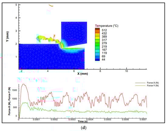Finite element simulation (a) v = 50 mm/min, feed = 0.3 mm/rev, DoC = 1 mm, (b) v = 100 mm/min, feed = 0.2 mm/rev, DoC = 1 mm, (c) v = 100 mm/min, feed = 0.3 mm/rev, DoC = 2 mm, (d) v = 150 mm/min, feed = 0.3 mm/rev, DoC = 2 mm.