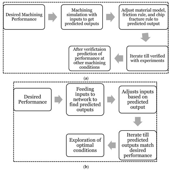 Figure 8a–c provide the workflow of finite element simulation, a conventional neural network and the proposed backward neural network. This backwards trained model would be ideal in the case real time monitoring output data were available through the use of dynamometers and other sensors. For clarity, we can consider the workflow of the standard approach to machining data and MLP Networks as well as why they would be used: the manufacturer desires certain output conditions (the dependent variables), and has control over the input conditions, which (as simplified here) are the cutting speed, feed rate, and depth of cut (the independent variables). The manufacturer feeds various input conditions to the network in order to see the predicted output conditions and whether they fit within the allowable tolerances. The network can provide the output condition much faster than a simulation would be able to.