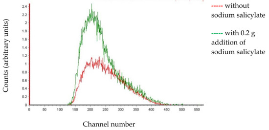 A significant number of Cherenkov photons cannot be detected by the photomultipliers placed in the LS counter since they are generated in the ultraviolet region. However, sodium salicylate added in a counting vial acts as awavelength shifter—it absorbs ultraviolet photons and re-emits them at longer wavelengths. This shift in wavelengths consequently leads to the detection of more photons and an increment in counting efficiency. In the case of 210Pb/210Bi detection, it was demonstrated that the addition of sodium salicylate > 1 mg/g increased detection efficiency due to the combination of wavelength shifting and the production of more scintillation light [14]. It is clear that the presence of sodium salicylate in 226Ra solution similarly generates a more intensive Cherenkov spectrum as seen in Figure 1.