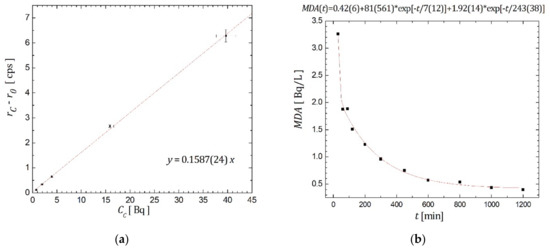 According to Equation (3), detection limits were evaluated while measurement duration was varied. MDA behavior is displayed in Figure 2b, and it can be observed that MDA~0.5 Bq/L (the limit set by the legislation in Serbia [6]) can be reached for 1000 min of counting.