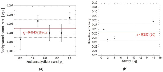 Small amounts of sodium salicylate added to the counting vial can significantly intensify the Cherenkov spectrum, as seen in Figure 1, meaning that the detection efficiency increases and MDA proportionally decreases. As shown in Figure 3, the effect of sodium salicylate addition to 226Ra calibration samples was tested. The graph from Figure 3a shows that an increasing mass of sodium salicylate added to the vials did not influence the count-rates of the background samples, therefore, the value r0 = 0.0045(10) cps can be regarded as constant. On the graph in Figure 3b, the consistency of the sodium salicylate addition was examined; a few samples were prepared with a different 226Ra activity into which the same mass of sodium salicylate, 0.2 g, was added. In all samples, the detection efficiency increased from 15.87 (24)% to the mean value 25.3 (20)%. These measurements indicate that sodium salicylate addition gives consistent results and provides stable samples, since the experimental results showed satisfactory repeatability. The addition of sodium salicylate to the counting vials during 226Ra measurement produced a similar effect on detection efficiency, as reported in the case of 210Pb/210Bi detection [14] and 228Ra/228Ac detection [13] via Cherenkov counting.