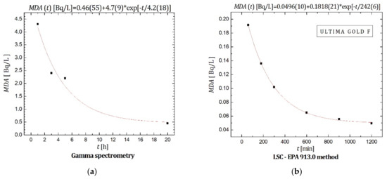 The presented graphs also contain equations the experimental data are fitted to. Distilled water was used as a blank sample for all investigated techniques. For the gamma-spectroscopic measurements, it was observed that MDA = 0.45 Bq/L when the measurement time was 20 h—therefore, gamma spectrometry offers the same MDA but for a longer measurement time in comparison with Cherenkov counting (without sodium salicylate). For the LSC-radon method. when samples were prepared with Ultima Gold F scintillator, MDA was calculated to be ~0.1 Bq/L for the total counting time of 300 min, which indicates that Cherenkov counting (without sodium salicylate) provides detection limits 10 times higher (or ~5 times higher in the case of sodium salicylate addition) than the LSC-radon method for the same measurement times.