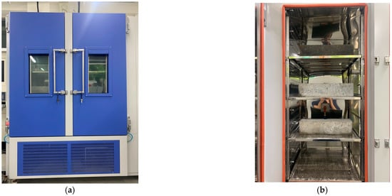 To analyze the conductive properties of the cement mortar incorporating CNTs undergone carbonation, the accelerated carbonation, compressive and flexural strength, electrical resistance, and porosity tests were carried out. External factors affecting the carbonation of cementitious composites are generally temperature, humidity, and carbon dioxide concentrations. In this study, to accelerate the carbonation of the conductive cement mortar, the prismatic specimens with a cross-section of 100 × 100 mm2 and a length of 400 mm were fabricated and stored in a carbonation acceleration chamber (SSENES Lab & Scientific Instrument, NEX1200) at a constant temperature of 20 ± 2 °C, constant relative humidity of 60 ± 5%, and CO2 concentration of 5% until the target age (up to 12 weeks), as demonstrated in Figure 3. The control specimens with the same dimension were cured in a water tank at 20 ± 2 °C for the same number of days. The specimens were cut into two halves and sprayed with a 1% phenolphthalein solution on the measurement surface, and the carbonation depth was then determined by measuring the distance from the edge of the specimen to the color boundary in accordance with the carbonation depth measurement method of cementitious composites (KS F 2596 []). The carbonation velocity coefficient (A) was calculated based on Equation (1).