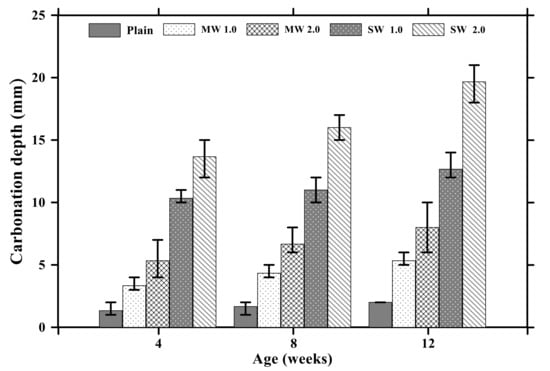 Figure 6 provides the results of carbonation depths of conductive cement mortar after the carbonation attack. In the case of the plain specimen, the carbonization depth increased to 2 mm with no coefficient of variation (COV) for 12 weeks. The depth of the MW 1.0 and MW 2.0 specimens was 5.3 mm with COV of 11% and 8 mm with COV of 25%, respectively, for 12 weeks whereas the carbonation depth of SW 1.0 and SW 2.0 was observed to be 12.6 mm with COV of 9% and 19.6 mm with COV of 8%, respectively, for 12 weeks. It signified that CNT clearly influenced accelerating the carbonation of conductive cement mortar.