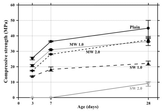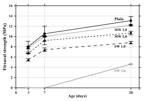 The flexural and compressive strength results of conductive cement mortar are shown in Figure 8 and Figure 9, respectively. The specimens incorporating CNTs showed a further decrease in compressive and flexural strengths compared with the plain specimen. Particularly, when the amount of incorporation of CNTs increased, the compressive and flexural strengths decreased because CNT is a hydrophobic composite, so it is impossible to be dispersed properly in the mortar mixtures, and it exists as pores in the composites, which results in decreases in the mechanical performance of CNT-embedded cementitious composites. This is also the reason why conductive cement mortar accelerated carbonation. Since SW 2.0 was not completely cured by the age of 7 days, its strength was zero. Because excessive chemical admixture (14%) was used, it was considered that it delayed the curing. It was clearly observed that compressive and flexural strength decreased as the amount of CNT incorporation increased, and the decrease of SW was greater than that of MW.
