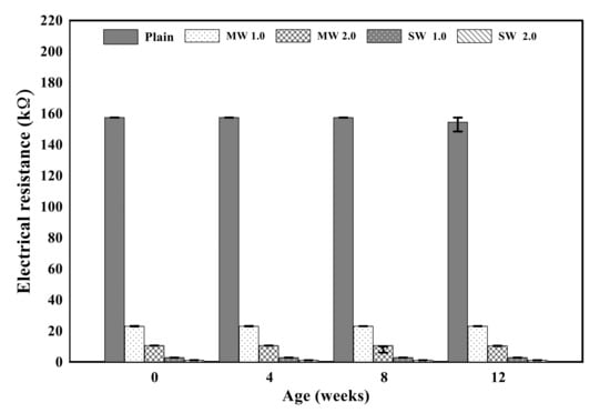 Figure 10 displays the electrical resistance properties of conductive cementitious before and after the accelerated carbonation. The electrical properties of the specimen before deterioration damage showed that as the CNTs were incorporated, the resistance value suddenly decreased to about 80–90%. By comparing MW with SW, it was clearly measured that the electrical resistance of SW was lower than that of MW. Since CNTs are conductive nanomaterials, conductivity can be given to the cement mortar and the small resistance is measured in spite of the bundle phenomenon induced by the van der Waals force in the composites. In other words, cement mortar mixing with CNTs has the capability to exhibit electrical performance. In addition, it was found that there was no significant change in the electrical resistance value as carbonation proceeded. The carbonation of cementitious composites did not result in internal damage, but it was a chemical change in which calcium hydroxide reacts with CO2 to produce calcium carbonate, which made only dense pore structures in the mixtures. It signified that the carbonation of conductive cementitious materials caused only mechanical damage so that there was no change in electrical performance.
