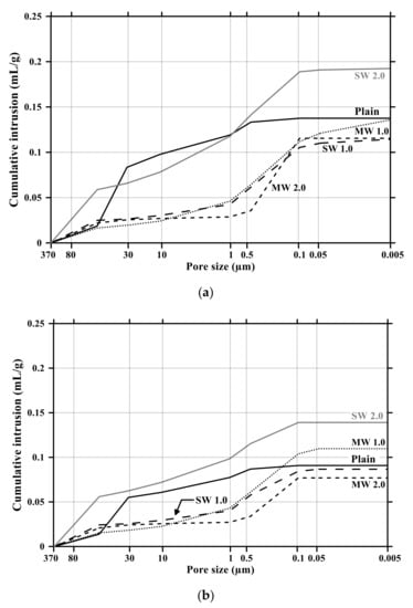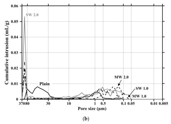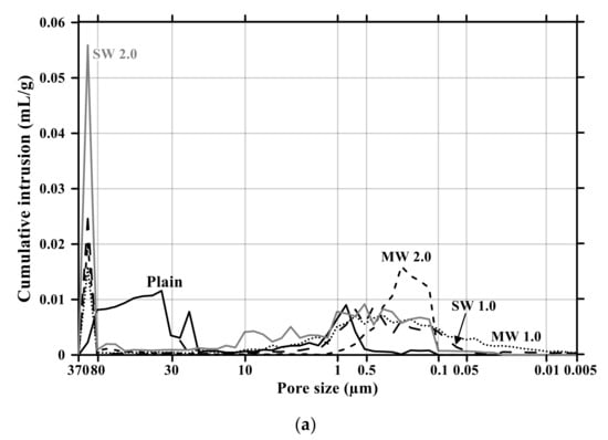 Figure 11 and Figure 12 present the pore size distribution and its cumulative pore volume of the conductive cementitious specimen before and after the carbonation attack, respectively. Before the carbonation in Figure 11a, it was observed that relatively large pores with sizes ranging between 370 μm and 80 μm increased with increasing the dosage of CNTs. In particular, in the range from 370 μm to 80 μm, the largest cumulative pore volume of SW 2.0 specimens was measured (see Figure 11a and Figure 12b) and the pore size of conductive cement mortar incorporating SW was relatively larger than that of the composites with MW, which are clearly different pore size characteristics from the plain specimen. The filling effect due to the diameter of 5–100 ηm and 1.2–3.0 ηm for MW and SW, respectively, resulted in no pore distribution between 0.1 μm and 0.05 μm for MW 2.0 and SW 2.0. However, it was obviously observed that the specimen of MW 1.0 and SW 1.0 had pores from 0.1 μm and 0.05 μm. These are because that CNTs were hydrophobic and difficult to be uniformly distributed in the composites. In the case of plain mortar, the pore size was between 370 μm and 35 μm and there were no micro-pore characteristics. These pores from 370 μm to 35 μm were considered to be the ones left as the remaining water evaporated after the water reacted with cement. Figure 11b provides the pore distribution curve of the cementitious composites after carbonation. The maximum pore distribution of the conductive mortar was the same as ones before the carbonation attack. Carbonation of concrete structure implied loss of alkali and it became neutralization. Carbonation did not result in the internal and/or external damage of the concrete structures caused by freeze–thaw or sulfuric acid erosion. Instead of physical change, the generated calcium carbonate caused the filling effect as shown in Figure 11 and Figure 12. Therefore, it was considered that no physical damage occurred in the conductive cementitious composites that had undergone carbonation so that the connection between CNTs was maintained and conductivity was not physically damaged. Moreover, as the CNT incorporation dosage increased, the distribution of large pores was measured. This is the evidence supporting the above results of compressive and flexural strength as well.
