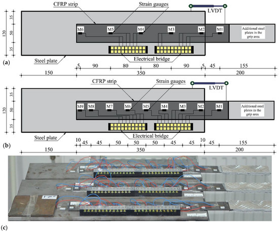 - By analyzing the strain variations along the bond line at different loading steps, it was observed that their distributions were initially concentrated near the loaded end. However, as the load increases, local debonding of the CFRP strip occurred and the strains distribution extended along the bond length. The limited extent of the strains demonstrates that the adhesive bonds are characterized by an effective bond length.