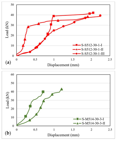 - The load–displacement response is characterized by two distinct patterns. The first pattern, specific to the cohesive failures, consists of two distinct branches: one of constant variation between load and displacement, demonstrating the initial linear behavior, and the other, where the load is relatively constant, but the displacements are rapidly increasing. The second pattern, specific to failures at the interface levels, is characterized by a single branch of linear behavior interrupted by the sudden and brittle failure. This response was commonly specific to the specimens bonded with Sikadur 330 adhesive. The maximum displacements are directly influenced by the axial rigidity of the CPRF strip and by the thickness of the adhesive layer since the maximum displacements were recorded for the S512 strip and Sikadur 30 adhesive with 3 mm thickness.