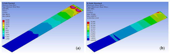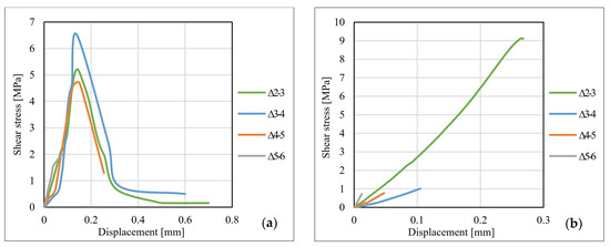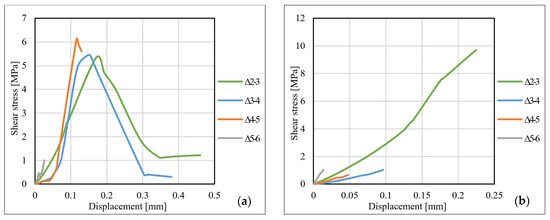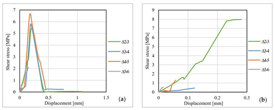 - By analyzing the shear stresses–displacement (bond–slip curves) distributions, it can be observed that both for the joints made with S512 CFRP strips and for those made with M514 CFRP strips, the displacements corresponding to the ultimate shear stresses are varying with respect to the type and the thickness of the adhesive. Thus, in most of the cases, the ultimate values of the shear stress and displacements decrease with the increase in the adhesive layer thickness. Additionally, the ultimate values corresponding to the specimens bonded with Sikadur 330 adhesive are significantly higher than those of the specimens made with Sikadur 30 adhesive. However, the bond–slip curves can be used as a design tool only for the cohesive failures since the latter is controlled by the shear strength of the adhesive.
