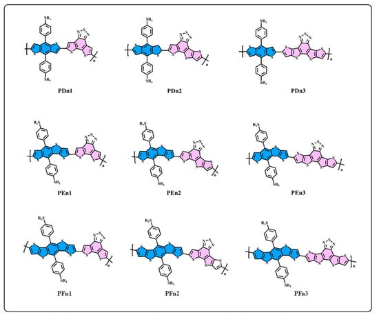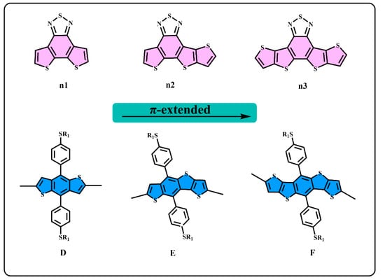 However, the intrinsic nature of the superior properties of asymmetric structures have rarely been studied in-depth, which is very important for designing high-performance donor/acceptor materials. In this work, as one of the most basic schemes, the asymmetric structures on the π-extend of the conjugate plane of the donor/acceptor units are mainly investigated. We start from a general structure unit (n1), as displayed in Figure 1, and extend the molecular conjugate plane, then we obtained the n2 and n3 units, and the donor units D, E, and F using the same method. Based on the D–A alternative principle, nine polymers are obtained, as shown in Figure 2. The units from n1 to n3 and D to F are monomers with a π-conjugation area expanded gradually. n2 and E are asymmetric structure units, so that the nature of the asymmetric structure can be deeply investigated. Quantum chemical methods are an economical and effective way to understand and predict molecular structure and properties, which could avoid cumbersome synthesis [39,40]. The properties of energy level and of the optical and excited states are crucial for polymer donors for the photo-electric conversion processes [41]. In this paper, density functional theory (DFT) is employed to optimize the geometries and calculate energy levels, ionization potentials (IP), electron affinities (EA), and reorganization energies (λ) [42]. In addition, the time-dependent density functional theory (TD–DFT) is employed to calculate the absorption spectrum and excited states [43]. As a result, we found that the asymmetric molecule PEn2 shows the minimum dihedral angles that could be beneficial to form better molecular stacking. This shows the advantage of asymmetric structures. The properties of energy level, energy gap (Eg), and the spectral absorption region could be regularly affected by changing the size of the conjugate region. The π-extend of the unitD/unitA has a close relation with the IP/EA of the molecules and further influences the charge extraction of the PSCs device. We hope that this study can offer an important guideline to the design of asymmetric donor polymers.