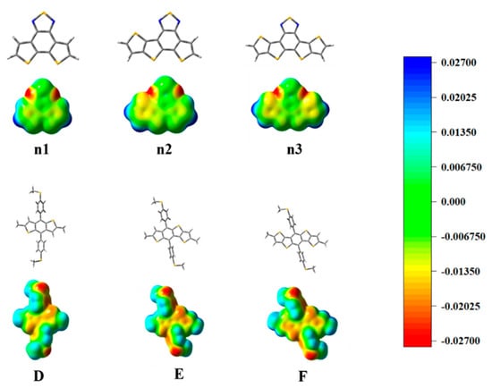 The optimized geometry and ESP distributions (electron density isosurface, 0.001 au) on the n1, n2, n3, D, E, and F models.
