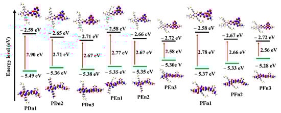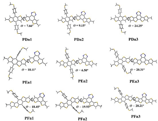 As shown in Figure 4, the ground state geometry of oligomers was optimized. The dihedral angles (θ) between the two moieties of PDn1, PDn2, and PDn3 are 7.66°, 9.15°, and 24.25°, respectively. The θ of PFn1, PFn2, PFn3 are 18.45°, 19.93°, and 20.21°, respectively. The θ increased with the π-extended among the PDn and PFn series oligomers; it is very likely that the expansion of the conjugate area leads to the enhanced rigidity. This phenomenon also appeared among PEn1 and PEn3, as 10.11° and 20.31° respectively. The size of the conjugation region also significantly affected the molecular planarity. However, the θ (PEn2) was only 6.50°; it was compounded by two asymmetric units (E and n2). The PEn2 with the minimum dihedral angles will be beneficial for intermolecular π–π stacking, which may produce good molecular stacking morphology among the BHJ PSCs [55].