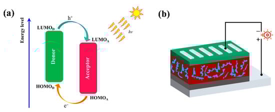 where JSC, VOC, FF, and Pin are short-circuited current density, open-circuit voltage, fill factor, and incident light intensity, respectively. The illustration of the working mechanism of the D/A blend and the device structure are displayed in Figure 6. The voltage is proportional to PCE and a higher VOC would be of benefit to achieve a high PCE, which could be estimated by Equation (2) [56]: