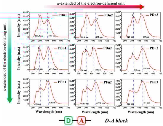 For organic semiconductor materials in PSCs, the sunlight absorbance and absorption spectrum of molecules play a vital role in the photoelectric conversion process. To deeply investigate the optical properties of these molecules, the light absorption spectra were simulated, as shown in Figure 7. All the nine spectra also expend two main absorption areas located at ~300 nm (peak 1) and 400~460 nm (peak 2). As an instance of PDn1, PDn2, and PDn3, peak 2 redshifts move from 410.4 nm to 439 nm, but peak 1 shifts slightly. Compared with PDn1, PDn2, and PDn3, the peak 2 redshift is mainly attributed to the π-extended unitA. According to molecular orbital theory, the π–π conjugation extended region could increase the energy of π orbital, but lower the π* and lower the energy gap (Eg), which correspond well to Table 1. The higher light-harvesting efficiency (LHE) value of the molecules would be of benefit for the high JSC of the PSCs devices. The corresponding LHE can be calculated by Equation (3) [58]: