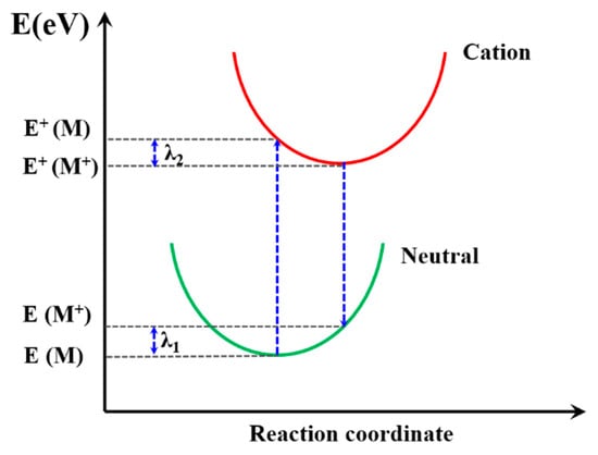 The reorganization energy (λ) is closely connected with the mobilities of organic materials [63] so that the λ is significant to predict the charge extract property within PSC device. It is the sum of two energy terms, as shown in Figure 8, and λ1 and λ2 could be described as [62]: