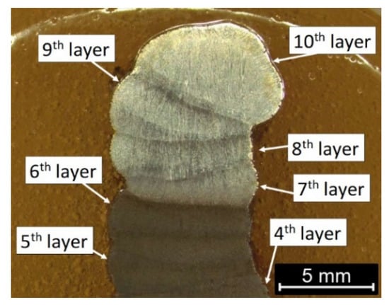 Macro- and microstructure analysis revealed the presence of two distinctly different zones—light and dark etching zones—on the cross-section of the wire arc additive manufactured part. Figure 2 shows the overall macrostructure of the part in the area of the last 7 layers. Revealing the structure required a change in the etching technique. Layers 1–6 were exposed during short-term etching, but the remaining layers (7–10) were not etched. Increasing the etching time led to the overpickling of the microstructure of layers 1–6 and the disclosure of the structure in layers 7–10. The effect of uneven etching of different areas in maraging steels is observed, among others, in the heat-affected zone in welded joints [61,62,63,64] and WAAM products [51,52]. Moreover, because the heat is dissipated from top to bottom and is limited in the direction of the wall thickness, it facilitates the formation of a columnar grain, observed in Figure 2. In the region of the 10th layer at a depth of about 0.5 mm from the face surface, a macroscopic solidification grain boundary is visible along the face. This boundary was created as a result of the contact of the crystallization front running from the fusion line with the crystallization front on the outer surface of the layer. The occurrence of an additional crystallization front required the creation of conditions for nucleation on the surface related to thermal supercooling. In the present case, the nucleation site may also be the liquid metal/slag interface. Internal defects are not observed. Unfortunately, the collinearity of the individual layers was not maintained, but this defect, however, does not affect the microstructural analysis. The fusion profile was similar to the “c” type, proposed by Ríos et al. [65]. This effect has been achieved using flux-cored wire, where, unlike the solid wire, the droplets detach from the tubular sheath and thus have a much larger incidence area. This results in a more evenly distributed heat energy of the arc over the surface of the weld pool. The fusion is wider and shallower, with a regular circular shape.