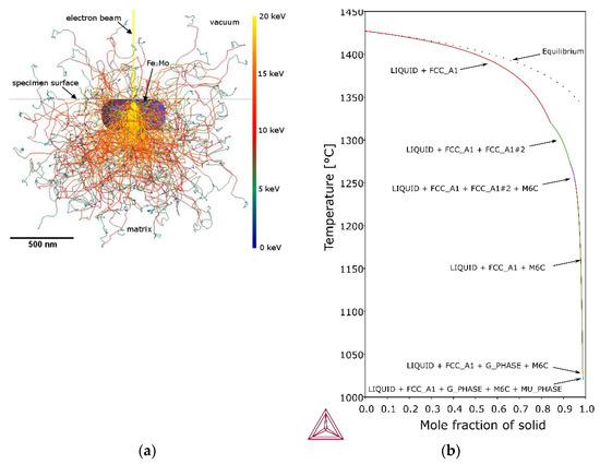 Monte Carlo simulation of electron trajectory in Fe2Mo precipitate and Fe-0.0768C-0.921Si-0.168Mn-4.38Mo-16.9Ni-11.7Co-0.332Ti model alloy matrix (a) and Scheil solidification simulation of Fe-0.0768C-0.921Si-0.168Mn-4.38Mo-16.9Ni-11.7Co-0.332Ti model alloy matrix (b).